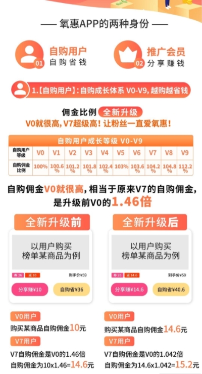 2、自購V0-V9成長系統(tǒng):從第六筆訂單開始,用戶從V0開始通過不斷的購物升級(jí)到V9.等級(jí)越高,自購傭金越高,“越買越省錢”。在半門檻活動(dòng)下,升級(jí)很容易。