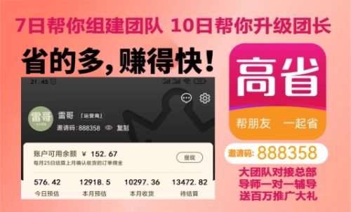 高?。ㄈW(wǎng)打折的高省)——完全不同于以往的斗客+淘客APP! 2023全新模式,我的直推也將歸你所有,報名送V8級,歡迎各位團長前來體驗! 也期待您的加入。 高省邀請碼888358 ,注冊助你推廣,一起打造百萬團隊!