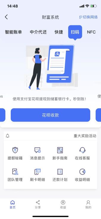 3,點擊首頁,在財富系統(tǒng)選擇上面掃碼,輸入金額生成二維碼再用支付寶掃碼即可完成。