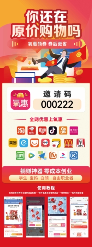 大家好! 我是氧惠 APP最大團(tuán)隊、聯(lián)合創(chuàng)始人雷哥的導(dǎo)師! 【氧惠】APP網(wǎng)購優(yōu)惠券免費(fèi)領(lǐng)取,分享就能掙米。 【氧惠】是一個自用省錢且傭金高,通過分享和推廣賺更多錢的平臺。 傭金更高,模式更好,終端用戶不流失。 0投資,穩(wěn)定可靠,期待您的加入。 我的直接晉升也將放在你的底下,你可以享受超高的傭金。 注冊以幫助您推廣。 雷哥的導(dǎo)師氧惠邀請碼是000222(這個邀請碼是超級邀請人邀請碼),教你如何在一年內(nèi)打造百萬團(tuán)隊。