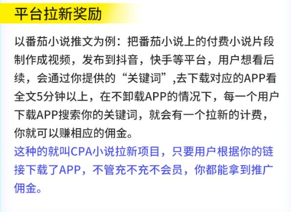 所謂CPS就是按業(yè)績提成,而CPA就是計件結(jié)算傭金,CPA不是銷售項目而是推廣拉新項目,簡單說就是不需要用戶去充值,只要他是新用戶下載注冊小說軟件即可。ecI菜譜美食網(wǎng)-眾歸云 - 24小時不關(guān)機的云端電腦_云主機_VPS掛機寶_免費掛機寶_0.1元試用,3-5元月租服務(wù)器提供