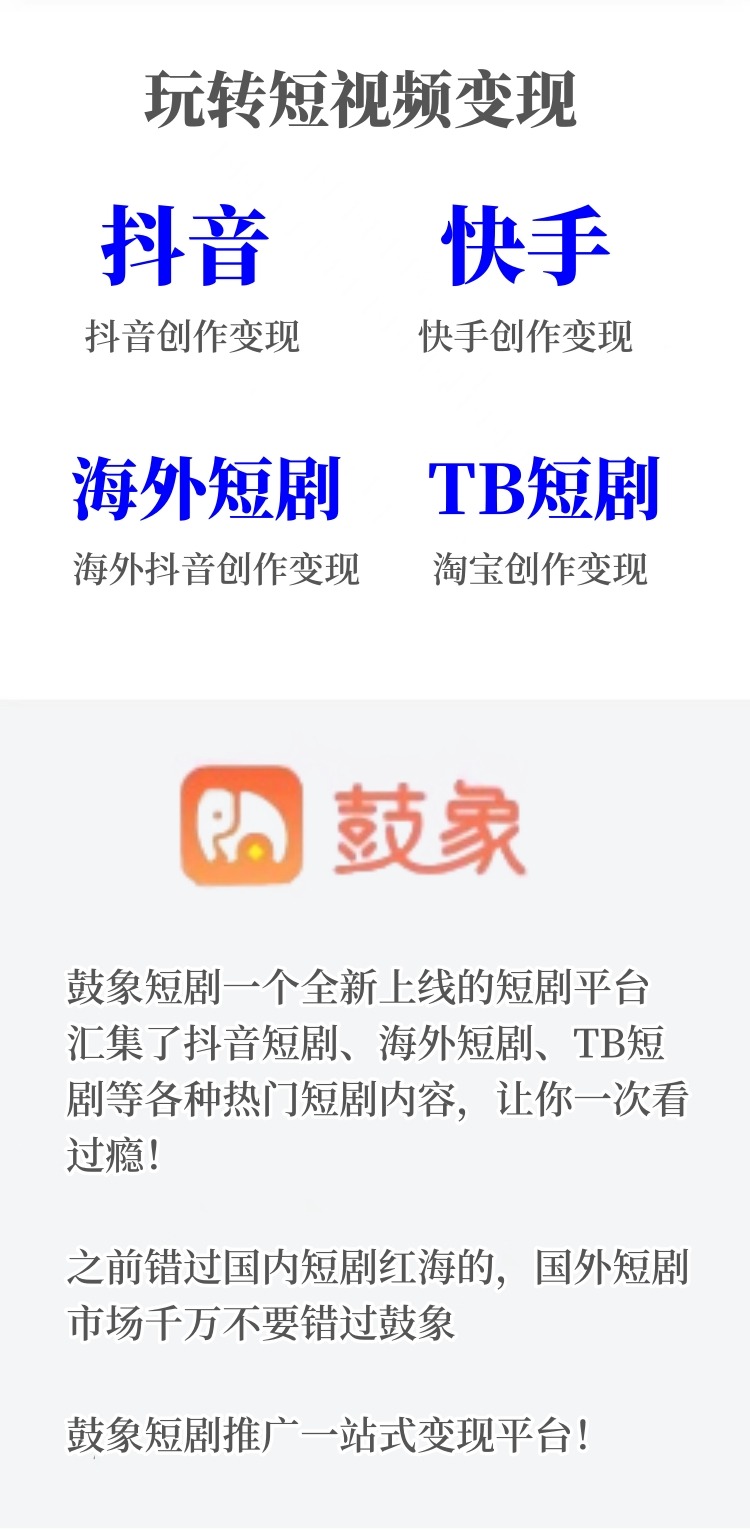 鼓象短劇最新,是一個新上線的短劇平臺,里面有抖音短劇、海外短劇、TB短劇等各種熱門短劇,想做哪個平臺就做哪個,讓你一次看個夠!而且,我們還提供了掙米的機會!