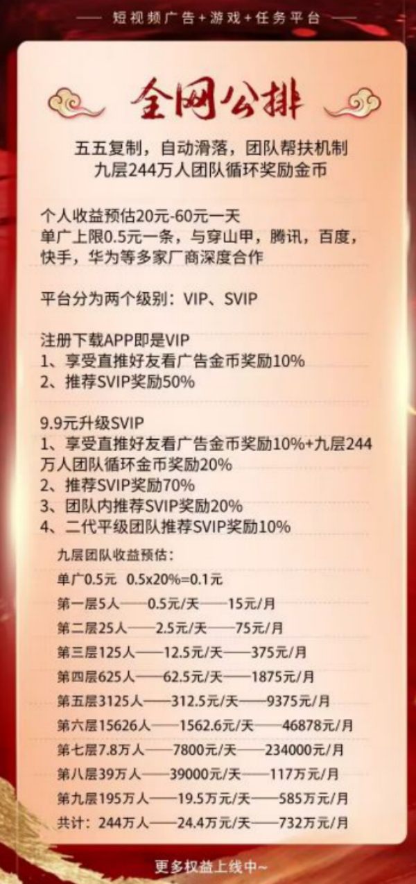 每日簽到觀看賺金幣,體線實(shí)時(shí)到賬賬,越看賺越多,獨(dú)家首發(fā)·全網(wǎng)公排,五五復(fù)制、九層244萬人團(tuán)隊(duì)循環(huán)獎(jiǎng)勵(lì)金幣