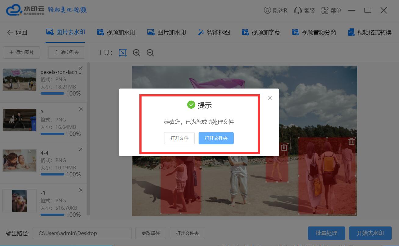 步驟四、很快軟件會(huì)跳出一個(gè)提示查看,提示成功去除水印,這時(shí)候我們可以點(diǎn)擊提示窗口上的打開(kāi)目錄按鈕進(jìn)入去水印后圖片的保存文件夾里面找到去水印后的圖片進(jìn)行查看和編輯操作。nQR菜譜美食網(wǎng)-眾歸云 - 24小時(shí)不關(guān)機(jī)的云端電腦_云主機(jī)_VPS掛機(jī)寶_免費(fèi)掛機(jī)寶_0.1元試用,3-5元月租服務(wù)器提供