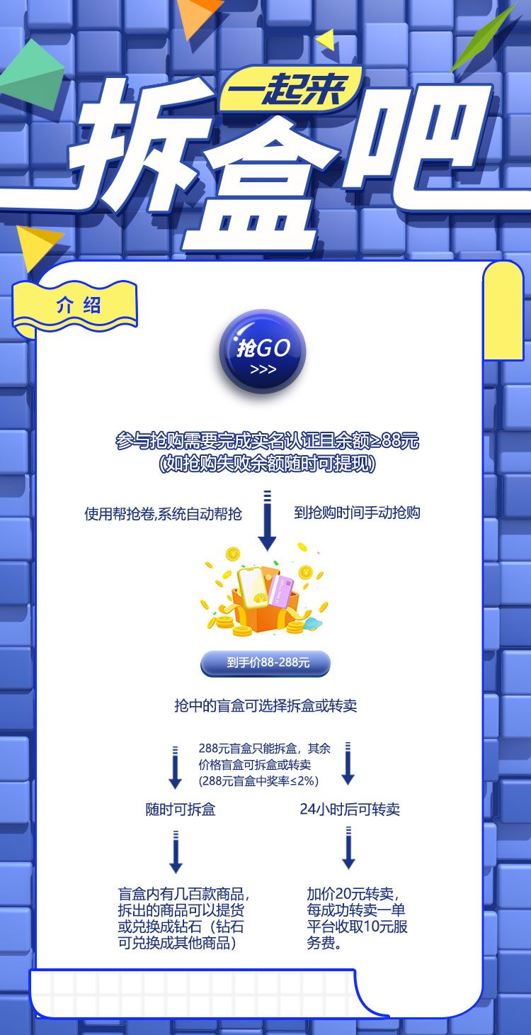 拆盒吧搶購商業(yè)邏輯今年全網(wǎng)最新長久模式,0泡沫!公司收取服務(wù)費(fèi),廣告收入模式運(yùn)營!公司和玩家收益五五分模式,只要玩家賺了10元,平公司收取10元服務(wù)費(fèi),就憑這收取服務(wù)費(fèi)的模式就能讓公司走得很遠(yuǎn)。搶購盲盒的價格在88- 288元之間(例:你今天搶購一個88元的盲盒,轉(zhuǎn)賣價格108元被別人買走。你收款98元公司收10元服務(wù)費(fèi)。108又以128轉(zhuǎn)賣出去,以此類推。直轉(zhuǎn)賣到原價288元的盲盒只能拆盒。靜態(tài)玩家每100單會搶≤2單288原價盲盒,所有經(jīng)銷商想領(lǐng)取積分獎勵必須持續(xù)購買288元價盲盒。這樣形成良性循環(huán),項目就能長久運(yùn)行)
